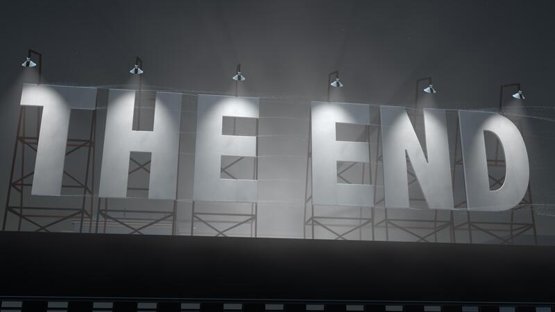brieven de einde in wit kleur Aan de dak van een uiteenvalt gebouw met turbulentie effect tegen bewolkt nacht achtergrond. 3d animatie Gratis Video