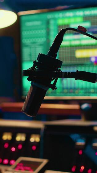 verticaal leeg professioneel opname studio met audio software Aan pc en controle bureau toetsen of schuifregelaars. technisch uitrusting gebruikt naar mengen en meester sporen, bewerken in post productie. Pro Video